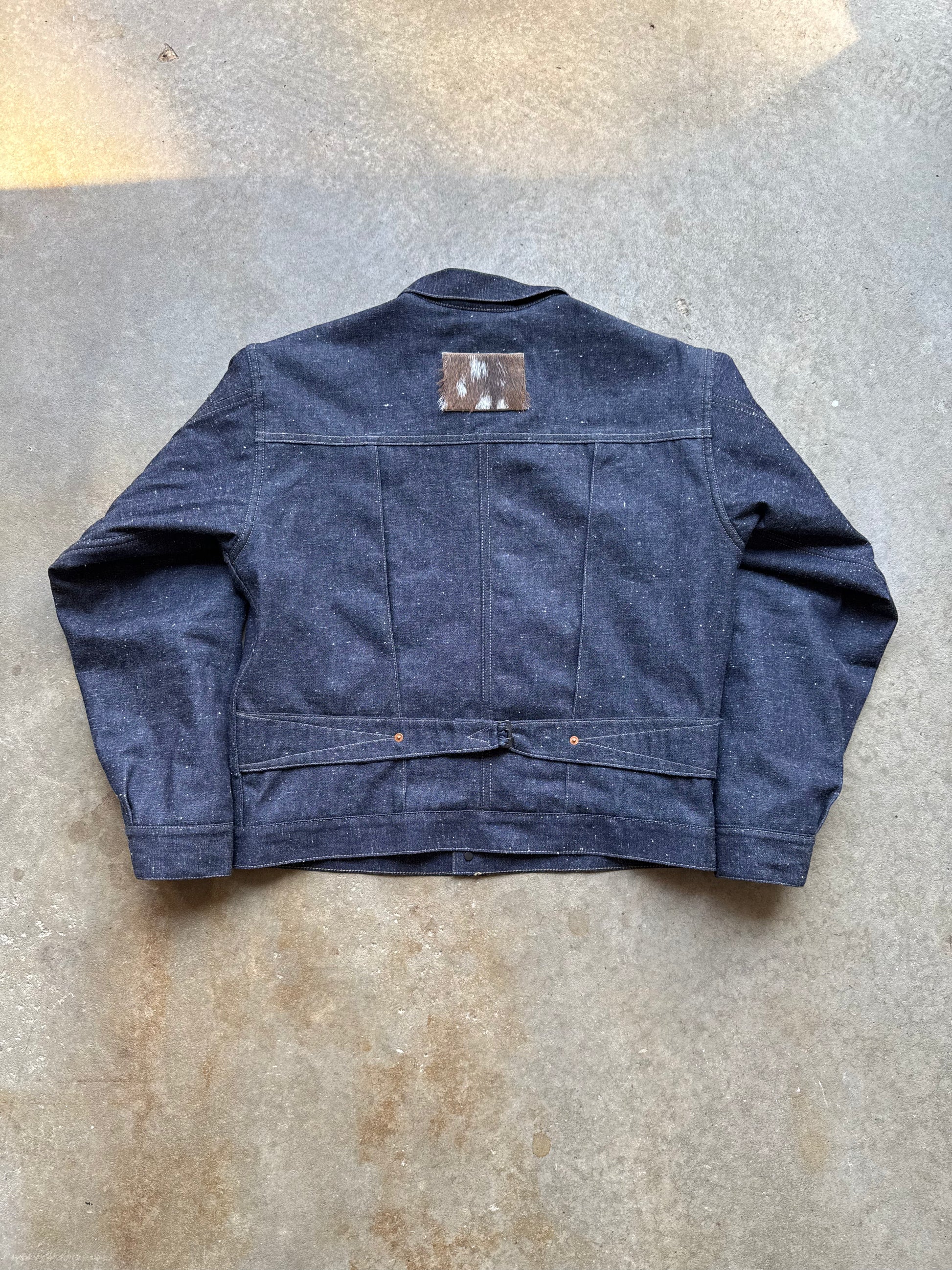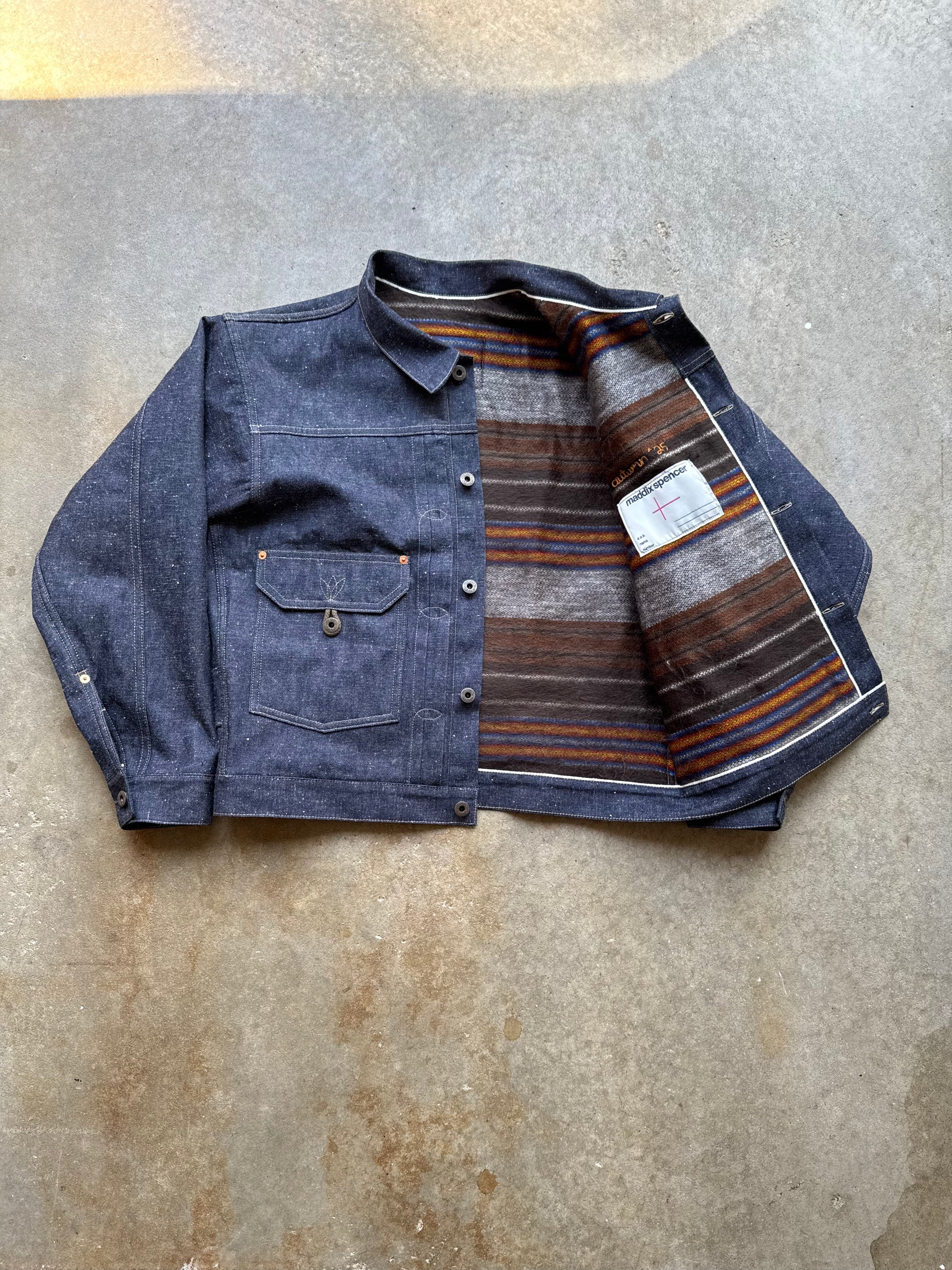 Constructed of a 9.5oz selvedge neppy denim and lined with an alpaca wool blanket. Features stitching details, union made buttons, and an axis deer hide patch.