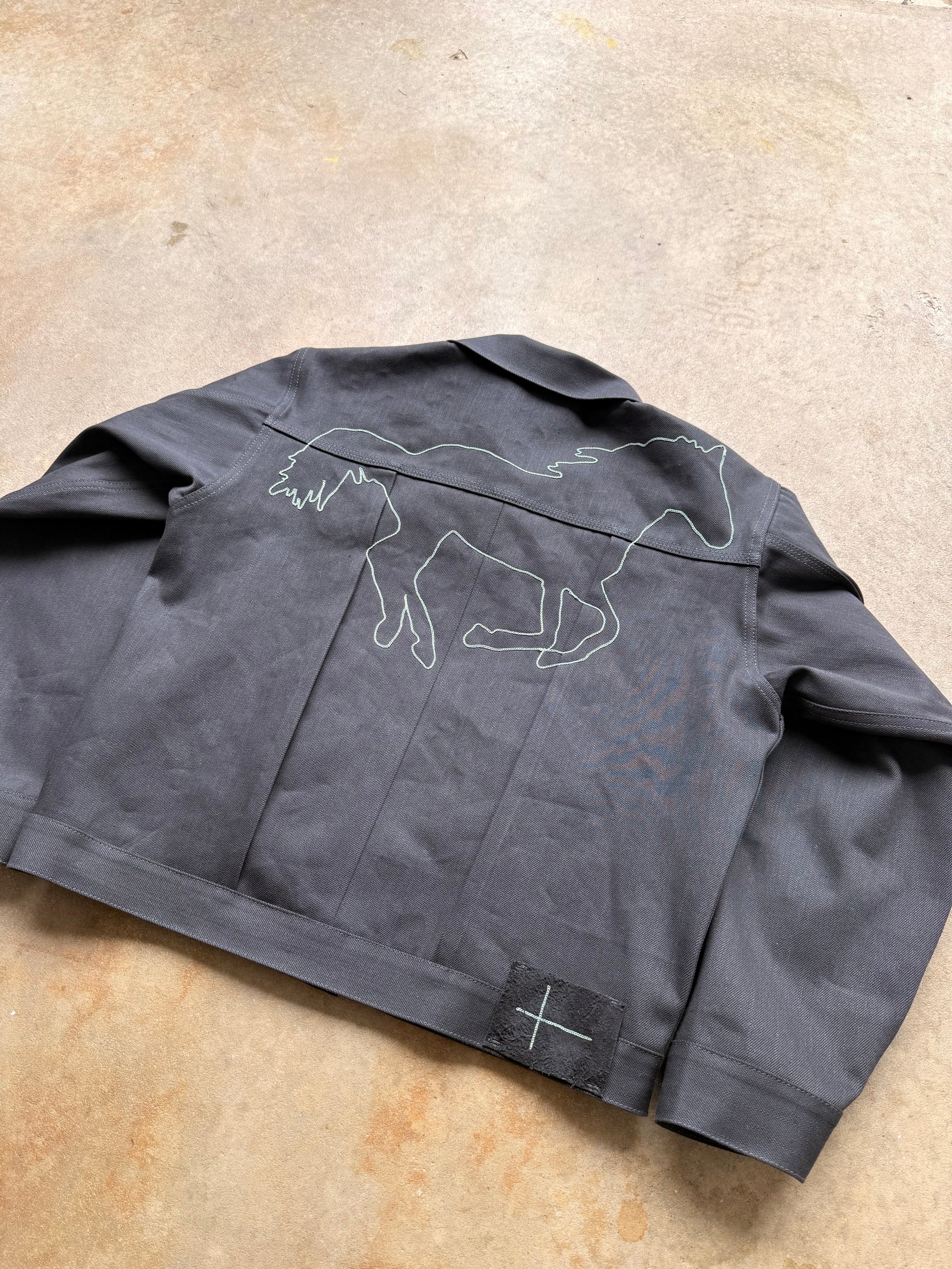 Constructed of a 15 oz selvedge denim and finished with iron wreath buttons and a huge chainstitched horse. Handmade in Holland, MI