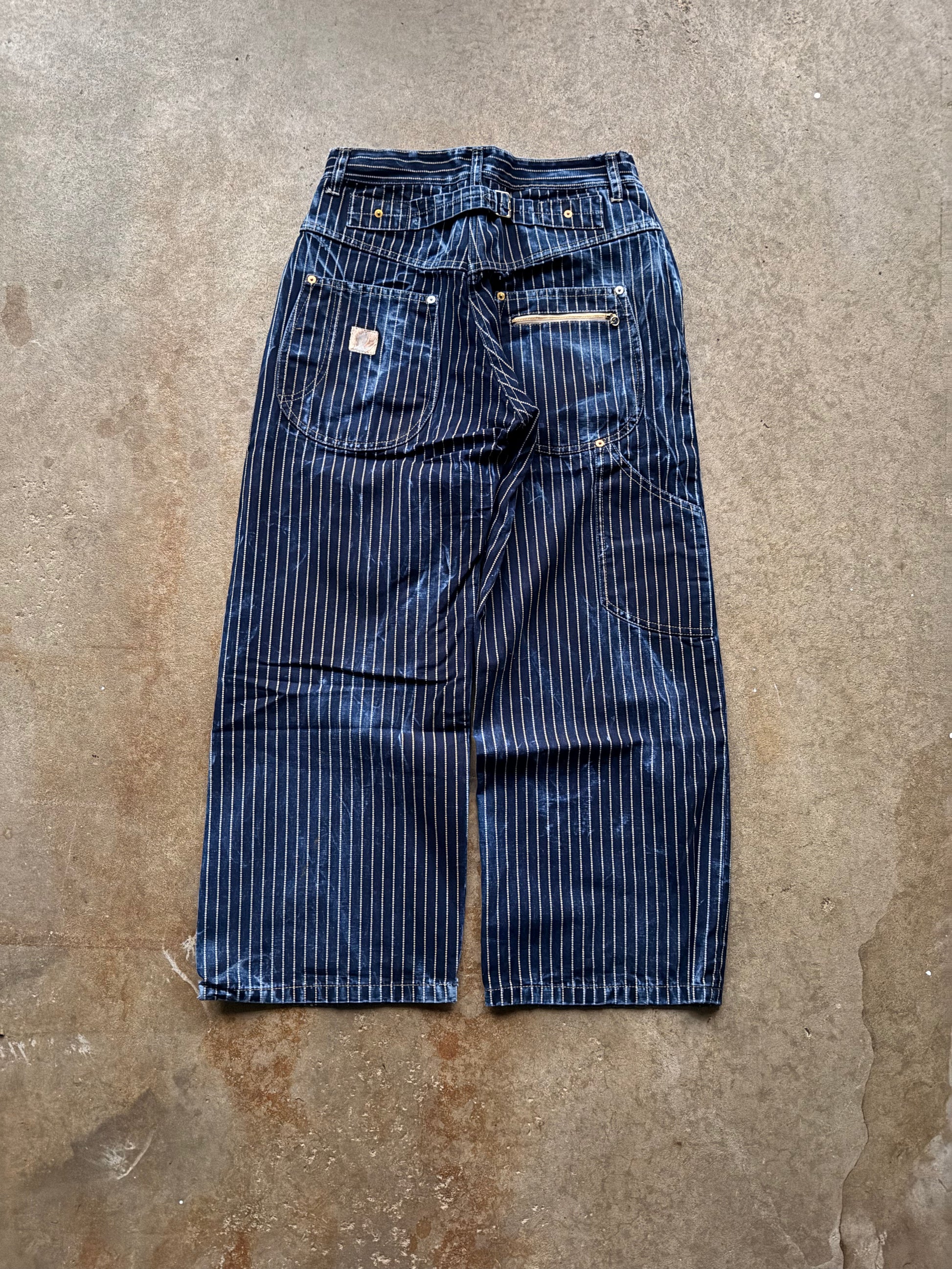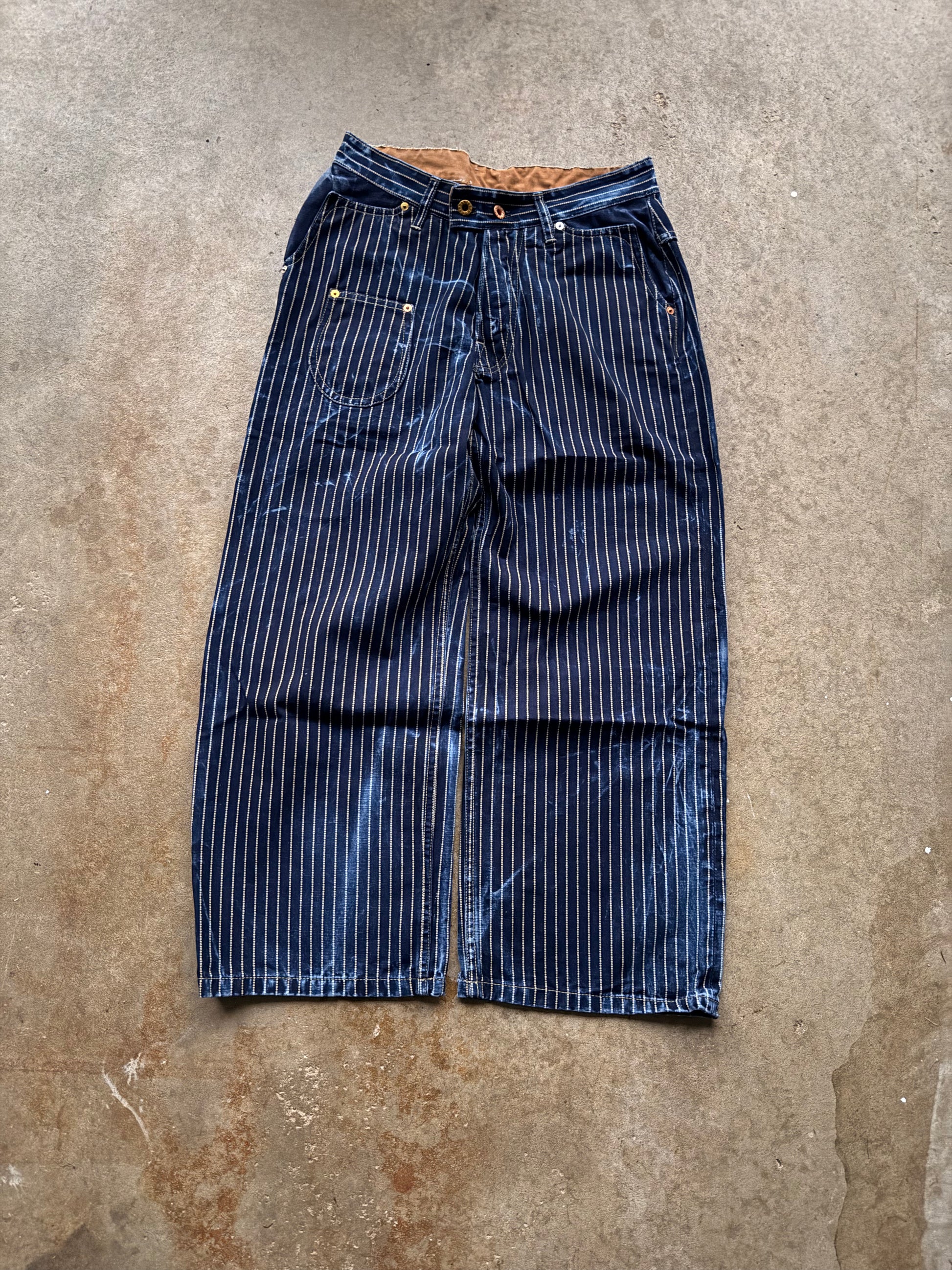 Constructed of selvedge wabash denim and duck canvas lining. These were the result of a stonewashing experiment. They have a sun faded and distressed look. Due to flaws created in the stonewashing process, these are heavily discounted.
