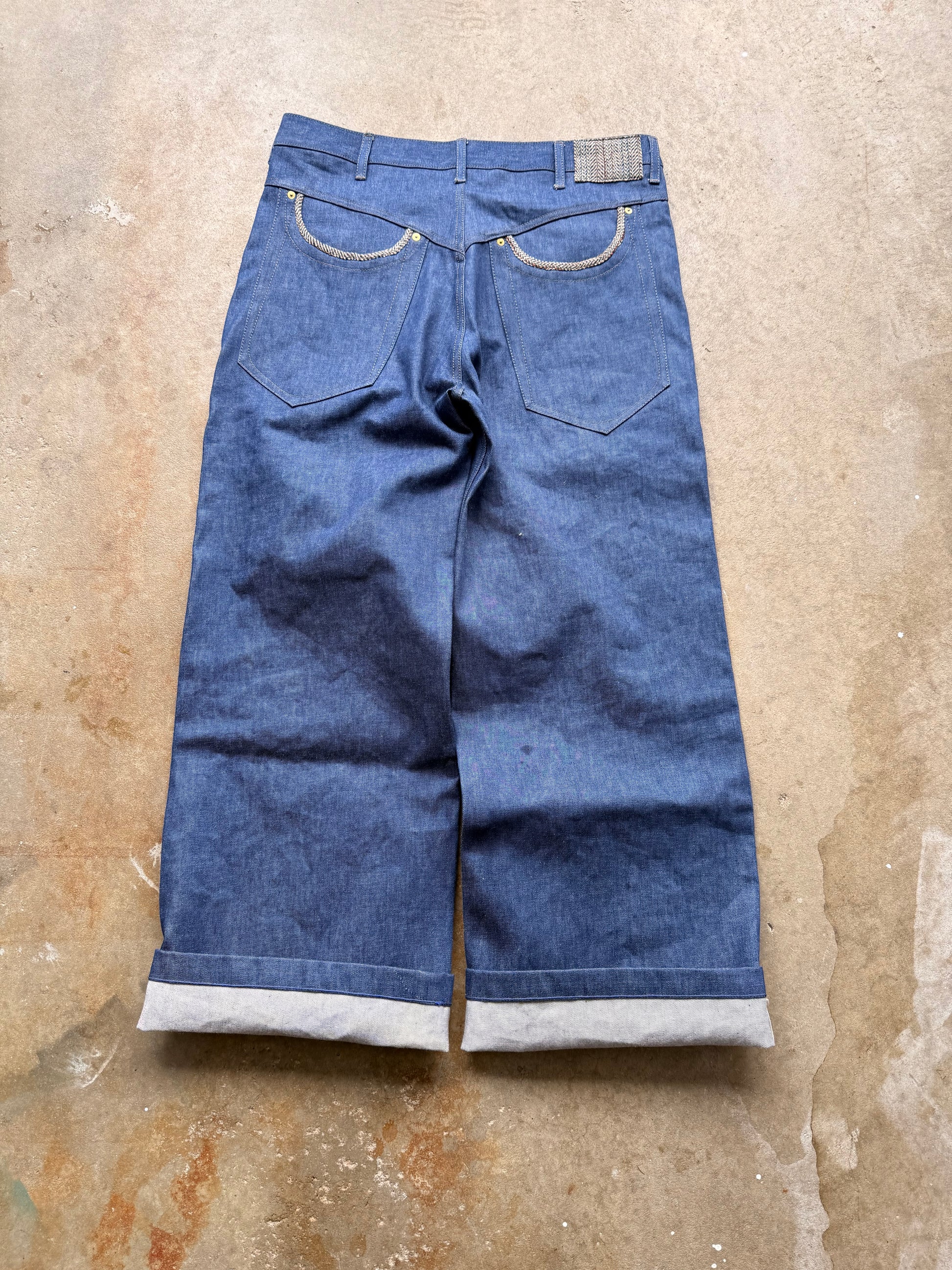 Constructed of 16oz denim from cone mills, accented with Harris tweed wool, and finished with raw brass hardware. Made by one in Holland, MI